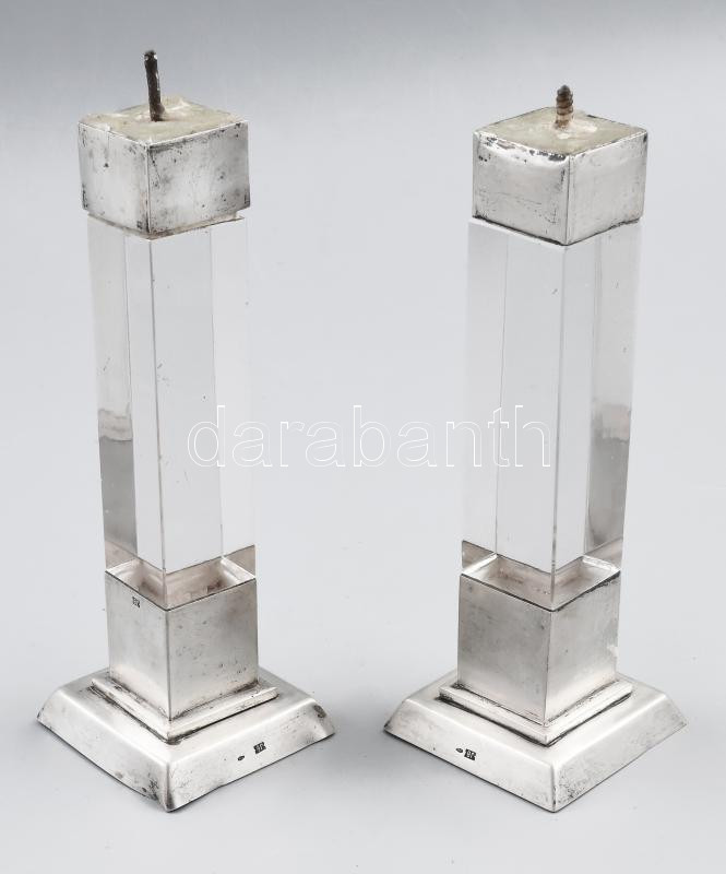 Leírás: Art deco kristályhasáb gyertyatartó pár ezüst (Ag) szerelékkel, jelzéssel, deformálódásokkal, pattogzással, m: 17 cm