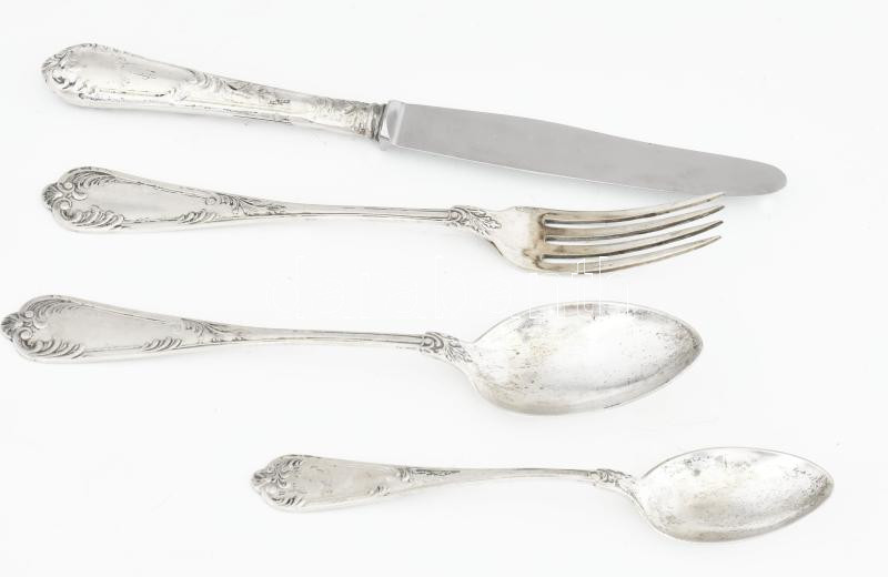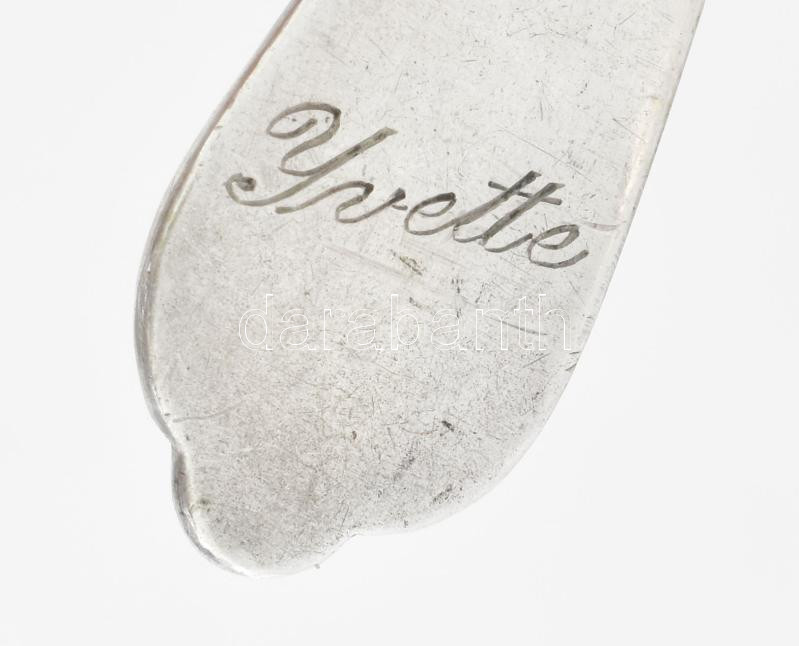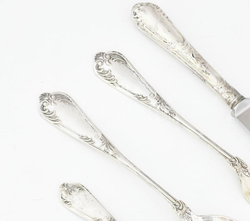Leírás: Ezüst (Ag) keresztelő evőeszköz: jelzett nettó 118 g + ezüst nyelű kés.