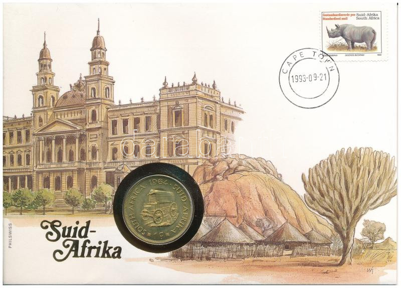 South Africa 1964. 1 Cent brass "Jan van Riebeeck" in envelope with stamp, cancellation, and a description in german C:UNC,AU
