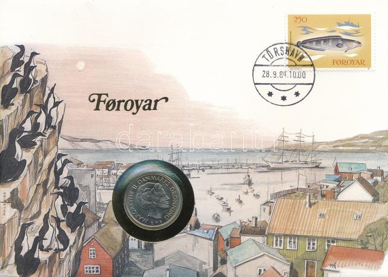 Feröer-szigetek 1983. 1Kr Cu-Ni felbélyegzett borítékban, bélyegzéssel, német nyelvű leírással T:UNC Faeroe Islands 1983. 1 Krone Cu-Ni in envelope with stamp and cancellation, with German description C:UNC
