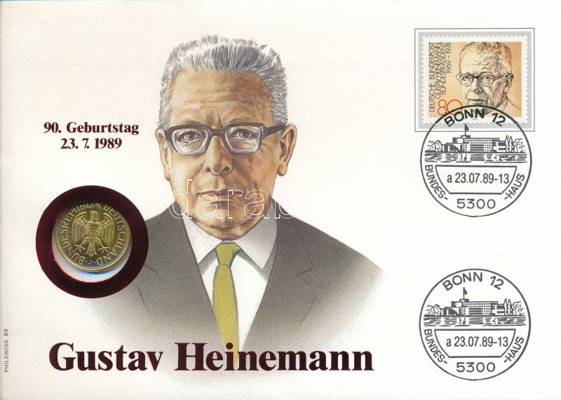 FRG 1989J 1 Mark gilded Cu-Ni "Gustav Heinemann" in coin envelope with stamps, cancellations and a description in german C:UNC small patina