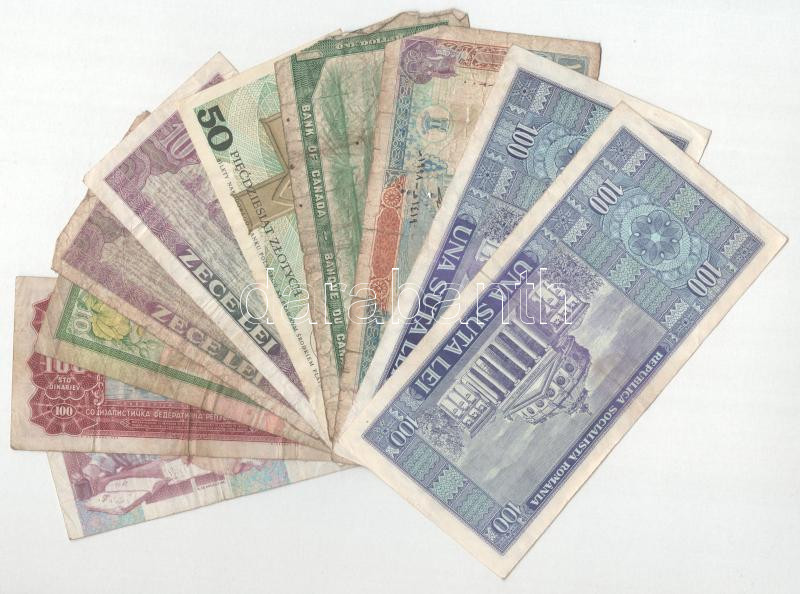 10db-os vegyes, nagyrészt gyenge tartású külföldi bankjegy tétel, közte Románia, Olaszország, Jugoszlávia, Srí Lanka, Lengyelország, Kanada, Szíria T:F-G közte ragasztott 10pcs of mixed foreign banknote lot mostly in poor condition, from countries such as Romania, Italy, Yugoslavia, Sri Lanka, Poland, Canada, Syria C:F-G with one taped banknote