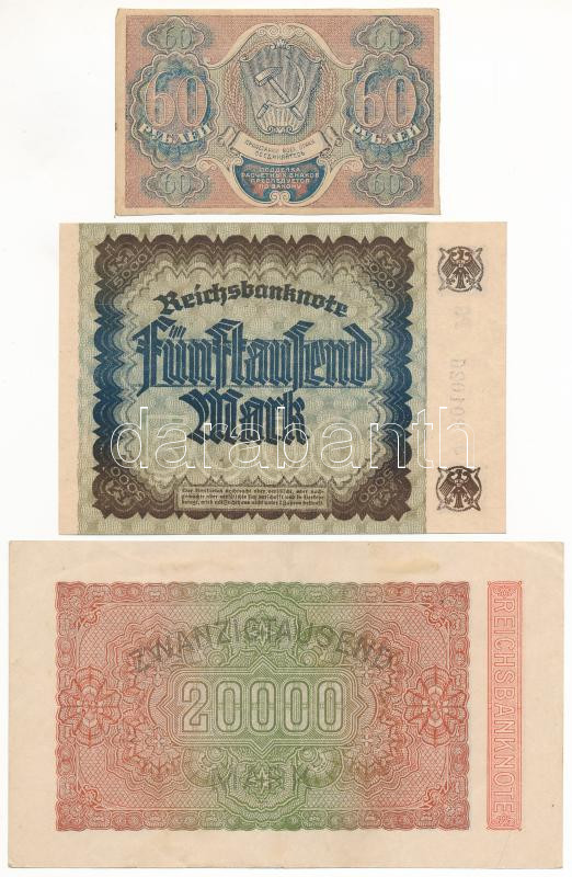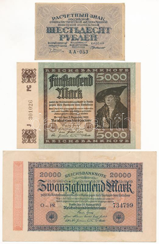 Leírás: Németország / Weimari Köztársaság 1922. 5000M + 1923. 20.000M + Szocialista Szövetségi Szovjet Köztársaság 1919. 60R T:AU-F Germany / Weimar Republic 1922. 5000 Mark + 1923. 20.000M + Russian Socialist Federated Soviet Republic 1919. 60 Rubles C:AU-F