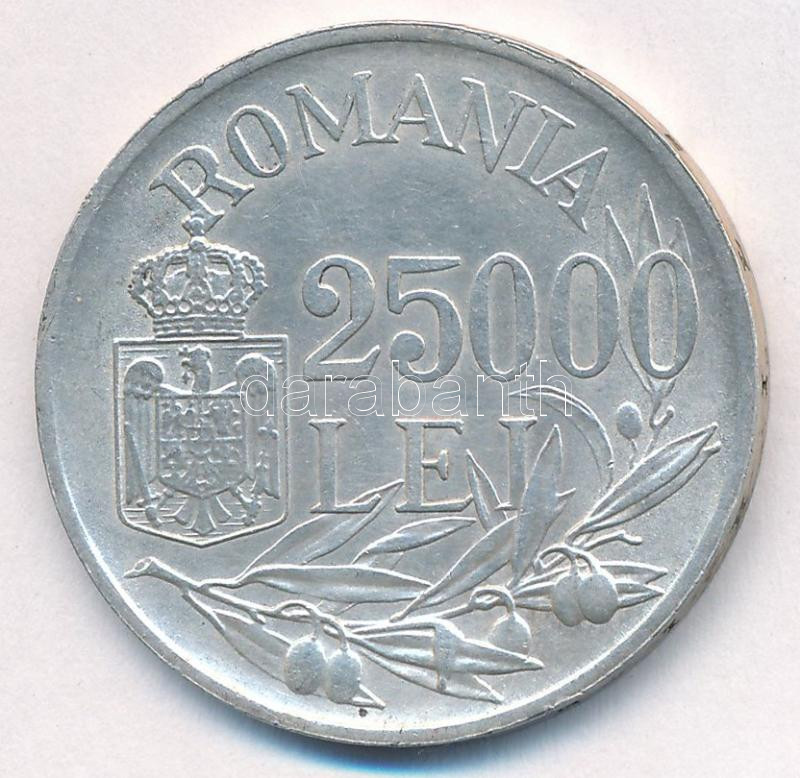 Romania 1... https://www.darabanth.com/hu/451-Gyorsarveres/451.0/Numizmatika/Kulfoldi-fem-es-ezustpenzek~1500015/Romania-1946-25000L-Ag-I-Mihaly-TAU-apro-ph-Romania-1946-25000-Lei-Ag-Mihai-I-CAU-tin~II2996144