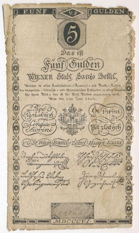 Leírás: 1806. 5G "Bécsi városi bankócédula" vízjeles papíron T:VG folt, kis szakadások, anyaghiány, tűzőgép ly.