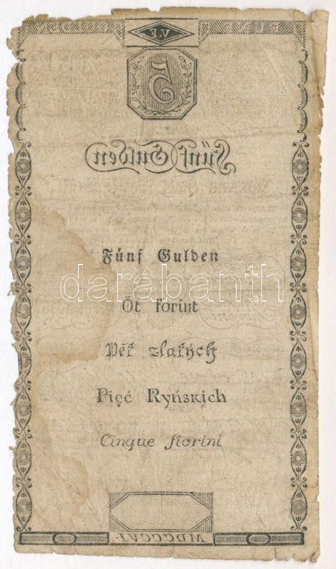 1806. 5G "Bécsi városi bankócédula" vízjeles papíron T:VG fo... https://www.darabanth.com/hu/451-Gyorsarveres/451.0/Numizmatika/Magyar-bankjegyek~1500007/1806-5G-Becsi-varosi-bankocedula-vizjeles-papiron-TVG-folt-kis-szakadasok-anyaghiany-~II3001669