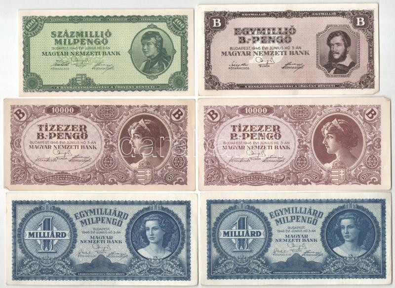 1946. 100.000.000MP + 1.000.000.000MP (2x) + 10.000BP (2x) + 1.000.000... https://www.darabanth.com/hu/451-Gyorsarveres/451.0/Numizmatika/Magyar-bankjegyek~1500007/1946-100000000MP-plus-1000000000MP-2x-plus-10000BP-2x-plus-1000000BP-TAU-VF~II2997307