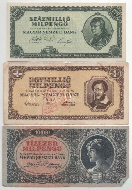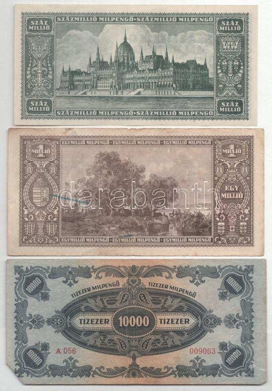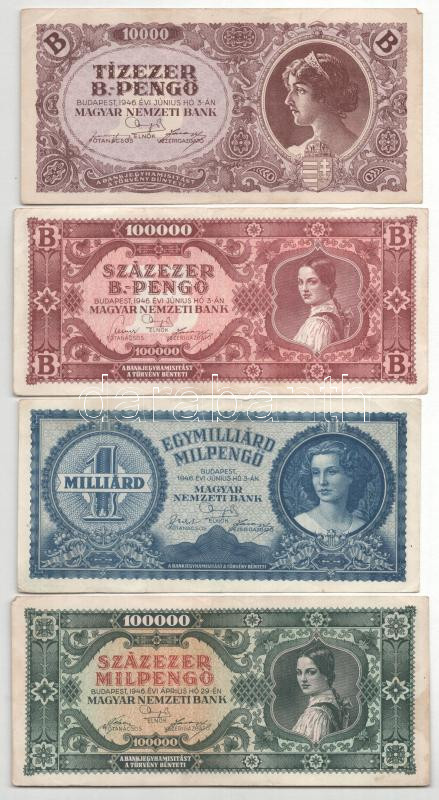 1946. 10.000MP-100.000BP (7xklf) T:F,VG közte kis szakadás https://www.darabanth.com/hu/451-Gyorsarveres/451.0/Numizmatika/Magyar-bankjegyek~1500007/1946-10000MP-100000BP-7xklf-TF-VG-kozte-kis-szakadas~II2999424