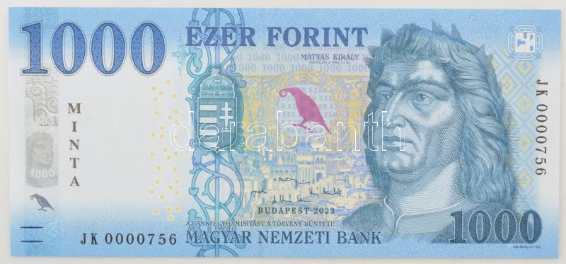 Leírás: 2023. 1000Ft "JK 0000756" sorszámmal, "MINTA" felülnyomással T:UNC