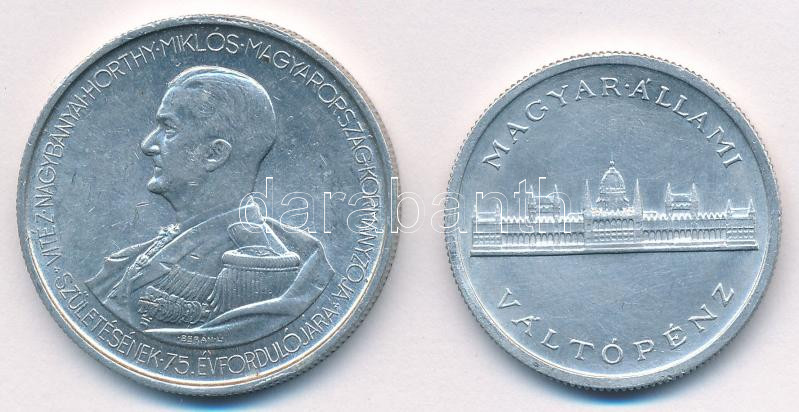 1943. 5P Al "Horthy Miklós születésének 75. évfordulójára" +... https://www.darabanth.com/hu/451-Gyorsarveres/451.0/Numizmatika/Magyar-es-magyar-verdejelu-fem-es-ezustpenzek~1500008/1943-5P-Al-Horthy-Miklos-szuletesenek-75-evfordulojara-plus-1945-5P-Al-Parlament-TAU-XF~II2960957