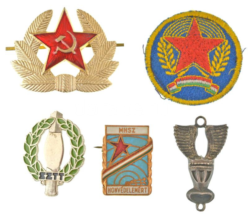 Leírás: 5db-os vegyes, főleg katonai jelvény, sapkajelvény, felvarró tétel, közte ~1960-1970. "SZTT (Szolgálati Tíz Tusa)" műgyantás fém jelvény (40x31mm) T:XF