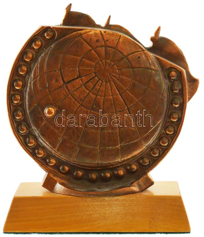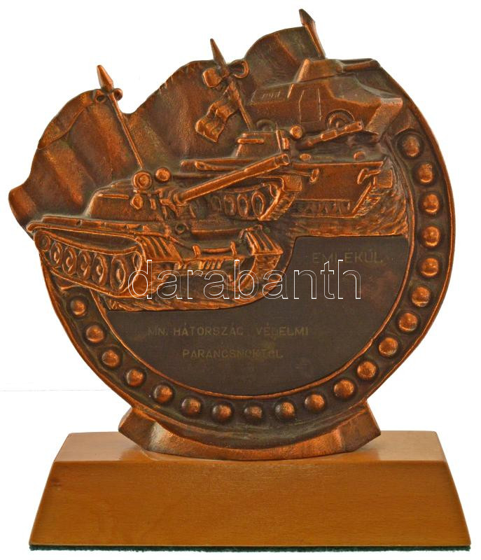 Leírás: ~1970. "Emlékül - MN Hátország Védelmi Parancsnoktól" nagyméretű, öntött, álló bronz plakett (180x180x15mm) fa talapzaton (175x75x34mm) T:XF