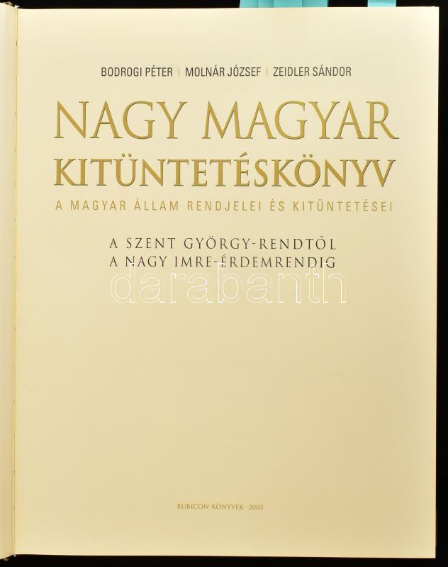 Bodrogi Péter-Molnár József-Zeidler Sándor: Nagy magyar kitüntetéskönyv. A magyar állam rendjelei és kitüntetései a Szent György-rendtől a Nagy Imre-érdemrendig. Szerk.: Rácz Árpád. Bp., 2005, Rubicon. Rendkívül gazdag képanyaggal illusztrált. Kiadói kartonált papírkötés, kiadói papír védőborítóban, jó állapotban.