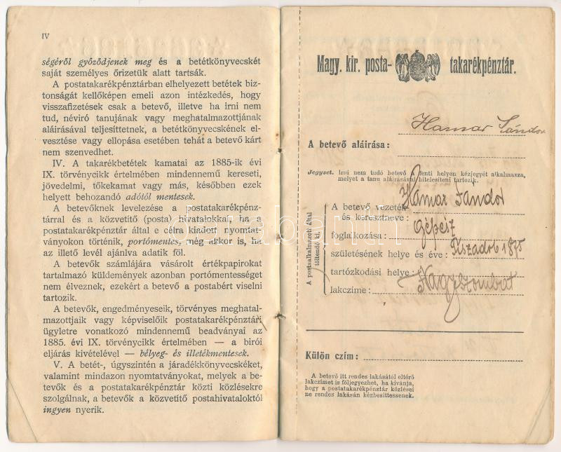 Leírás: 1914. "Magyar Királyi Postatakarékpénztár Budapesten" betét-könyvecske kitöltve