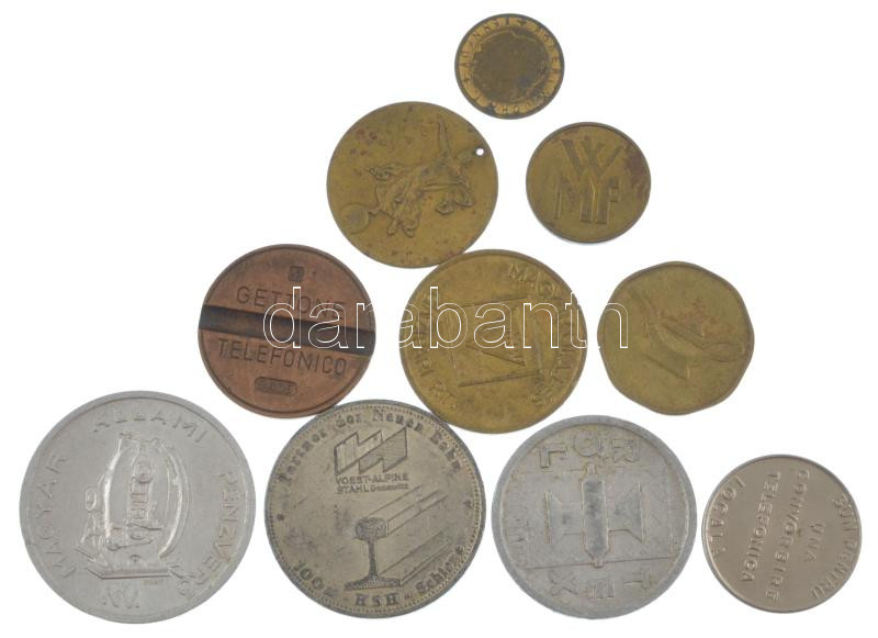 10xklf magyar és külföldi bárca-, zseton- és emlékéremtétel, közte 1949. "Budapest Nemzetközi Őszi Vásár" kétoldalas Al zseton (32mm) + DN "RÖLTEX" kétoldalas Al zseton (28mm) T:vegyes