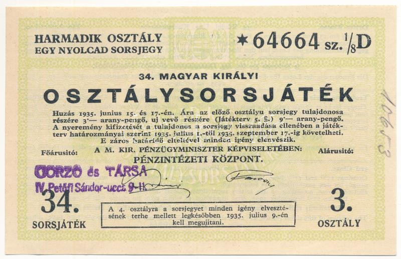 1935. "34. Magyar Királyi Osztálysorsjáték" harmadik osztály... https://www.darabanth.com/hu/451-Gyorsarveres/451.0/Numizmatika/Reszvenyek-es-sorsjegyek~1500005/1935-34-Magyar-Kiralyi-Osztalysorsjatek-harmadik-osztaly-egynyolcad-sorsjegye-belyegzesse~II2951641