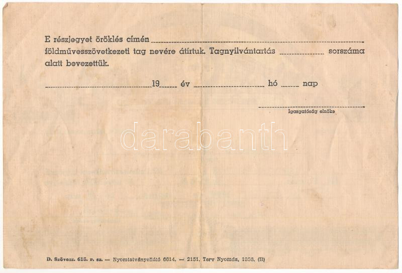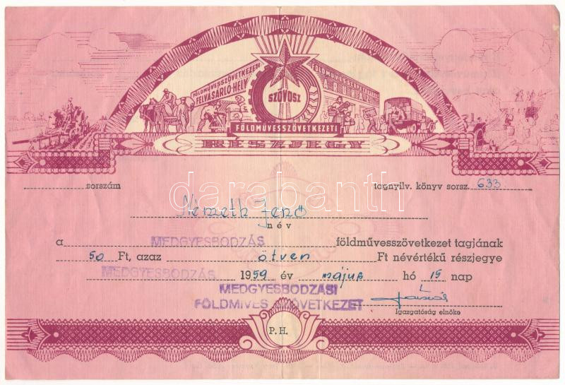 1959. "SZÖVOSZ - Földművesszövetkezeti Részjegy" névre szóló... https://www.darabanth.com/hu/451-Gyorsarveres/451.0/Numizmatika/Reszvenyek-es-sorsjegyek~1500005/1959-SZOVOSZ-Foldmuvesszovetkezeti-Reszjegy-nevre-szolo-reszjegye-50Ft-rol-kitoltve~II2959532