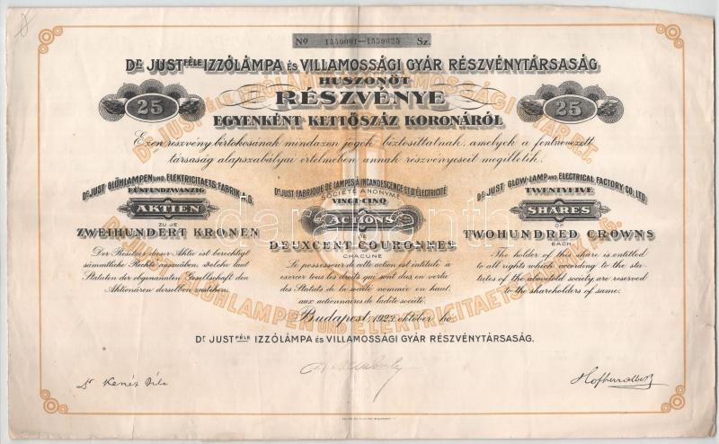 Budapest 1923. "Dr. Just-féle Izzólámpa és Villamossági Gyár Részvénytársaság" 25 részvénye egyben, egyenként 200K-ról, szelvényekkel magyar, francia és német nyelven T:F
