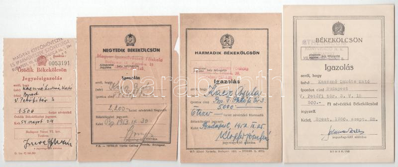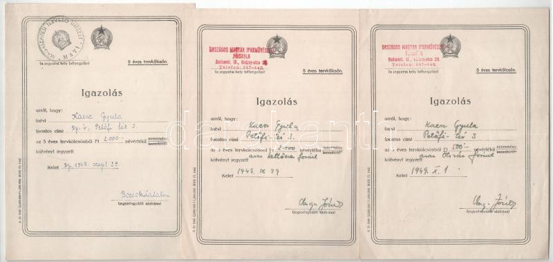 Budapest 1949-1953. Kaesz Gyula bútortervezÅ‘, épÃtész, az Iparművészeti FÅ‘iskola rektorának és feleségének, Lukáts Kató grafikusnak 7db névre szóló, kitöltött békekölcsön igazolása az Országos Magyar Iparművészeti FÅ‘iskola, a Magyar KépzÅ‘művészek és Iparművészek Szövetsége, az Athenaeum Könyvkiadó és a MagasépÃtési TervezÅ‘ Intézet jegyzési bélyegzÅ‘ivel T:AU-F