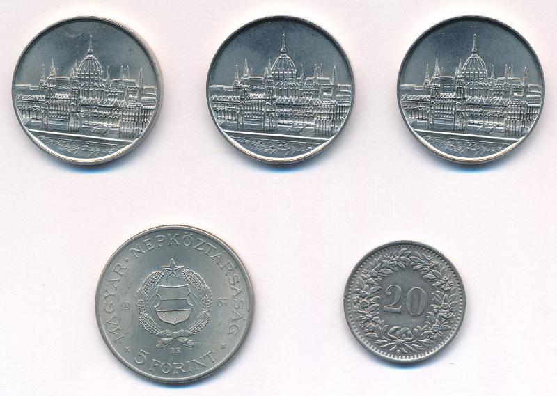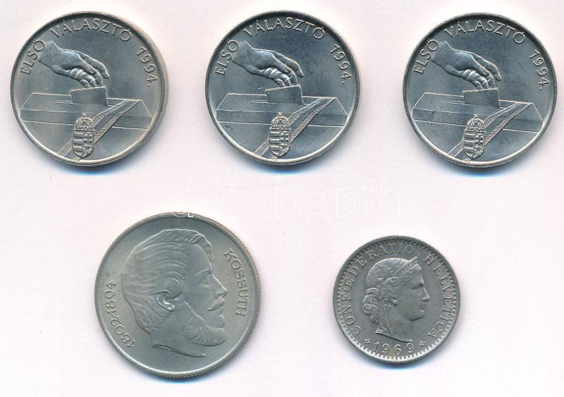Leírás: Vegyes: 1994. "Első választó" kétoldalas fém emlékérem (25mm) (3x) + 1967. 5Ft Cu-Ni-Zn "Kossuth" + Svájc 1969. 20r Cu-Ni T:AU
