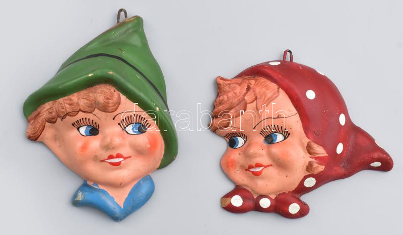 Leírás: Kerámia fiú és lányka fali dísz. Kézzel festett, jelzés nélkül, kis kopással 12, 15 cm