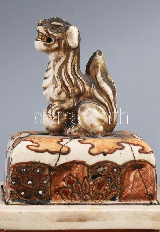Leírás: 2 darab antik japán fedeles váza, négy lábon áll, állatfigurás díszítéssel, sérült, hiányos, fedelek ráragasztva a vázatestre, m: 24 cm