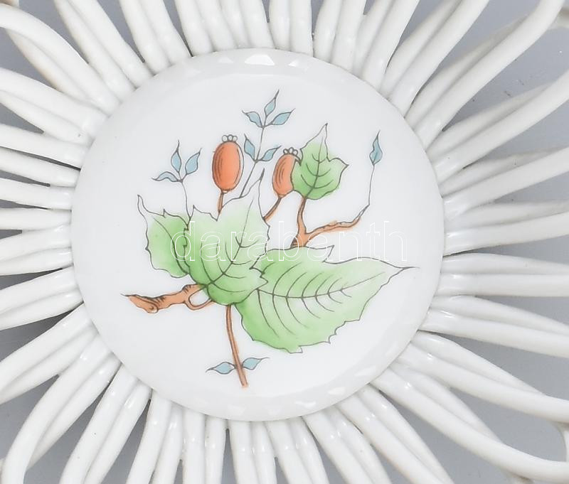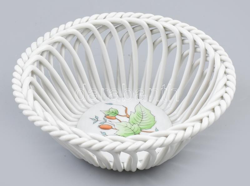 Leírás: Herendi csipkebogyó mintás fonott kosár kínáló. 2. oszt. jelzéssel, hibátlan, d: 13 cm