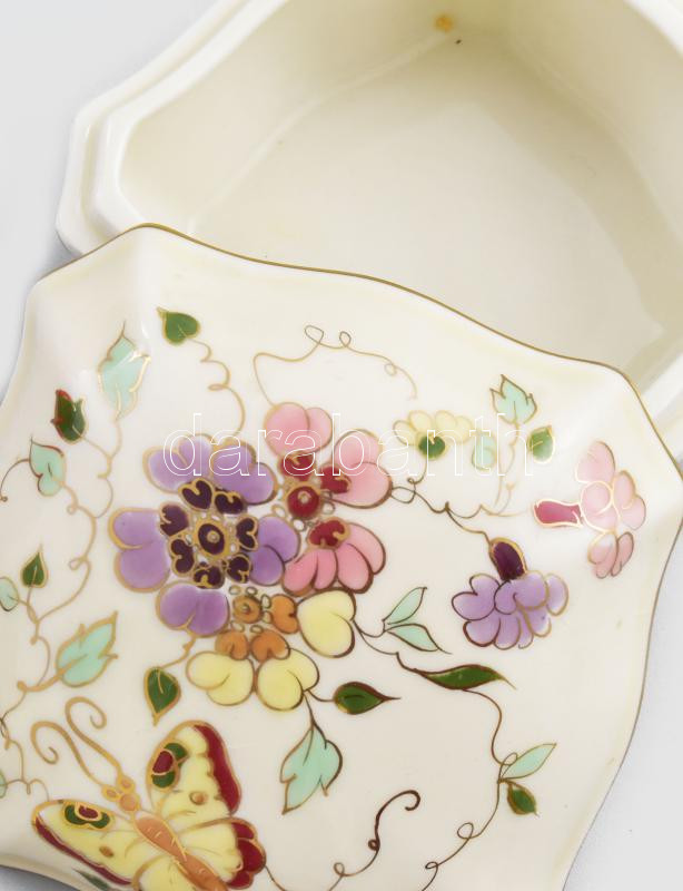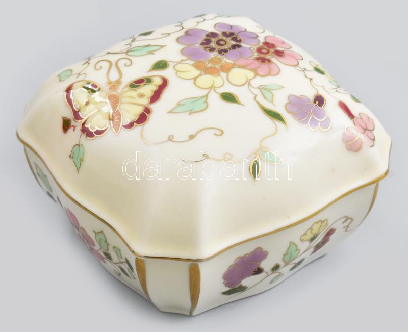 Leírás: Zsolnay pillangó mintás bonbonier, kézzel festett, jelzett, hibátlan (alján mázrepedéssel), 10,5x10,5cm
