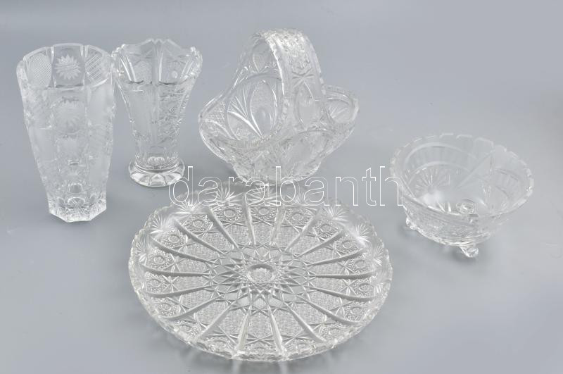 Leírás: 5 darab csiszolt mintás kristály tárgy: kínálók, vázák. Minőségi kristály tárgyak, vegyes méretben, kopással.