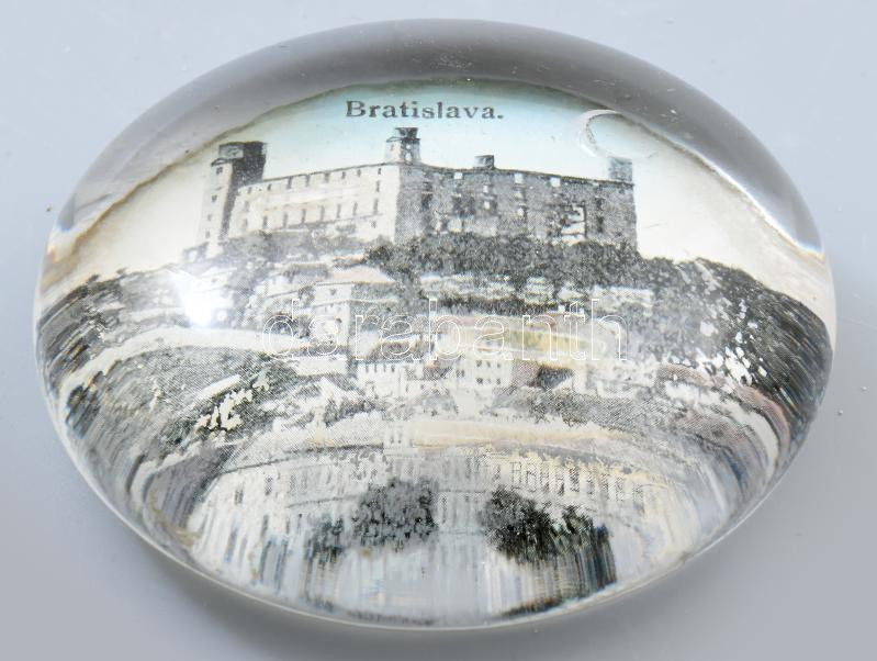 Leírás: Bratislava városképpel üveg levélnehezék, kis ütődéssel, jelzés nélkül, d: 8 cm
