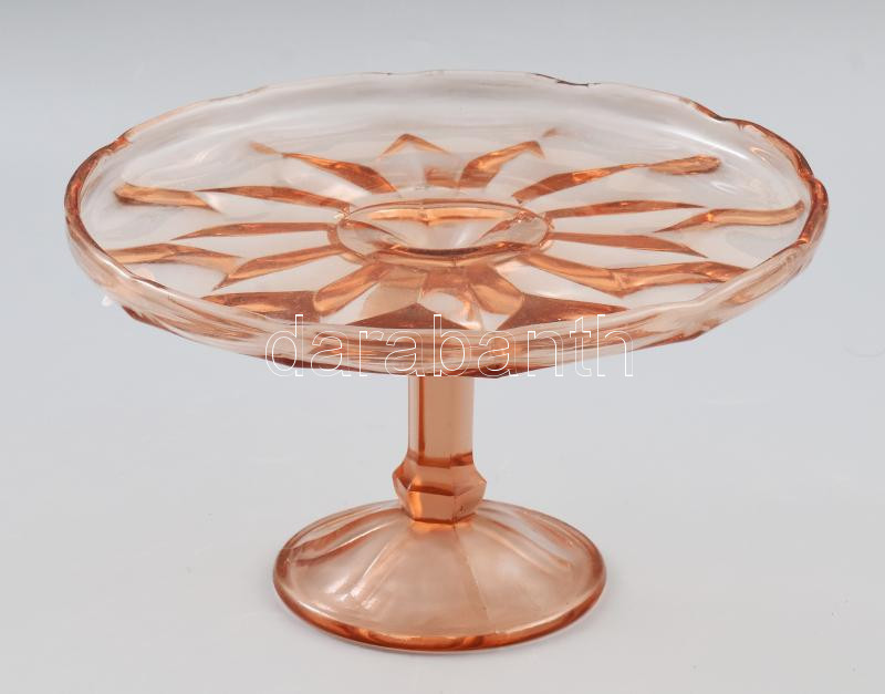 Leírás: Formába préselt barackszínű talpas üvegkínáló, kis kopottsággal, d: 24 cm, m: 14 cm