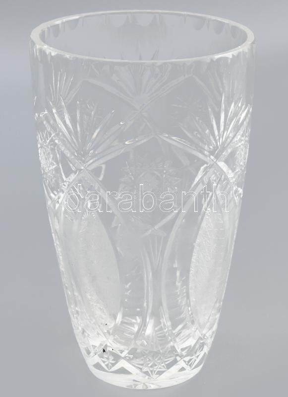 Leírás: Ólomkristály váza, gazdag csiszolással díszítve, jelzés nélkül, kis kopással, m: 20 cm