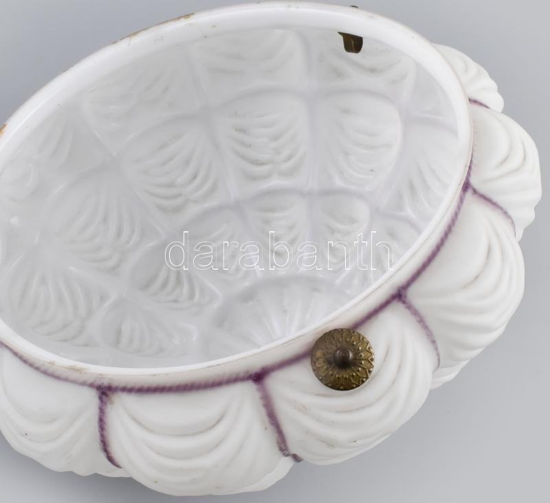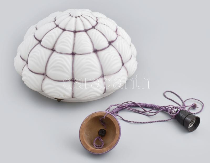 Leírás: Szecessziós tejüveg hólyagos lámpabúra. Működő szerelékkel, kis kopással, d: 37 cm, m: 22 cm