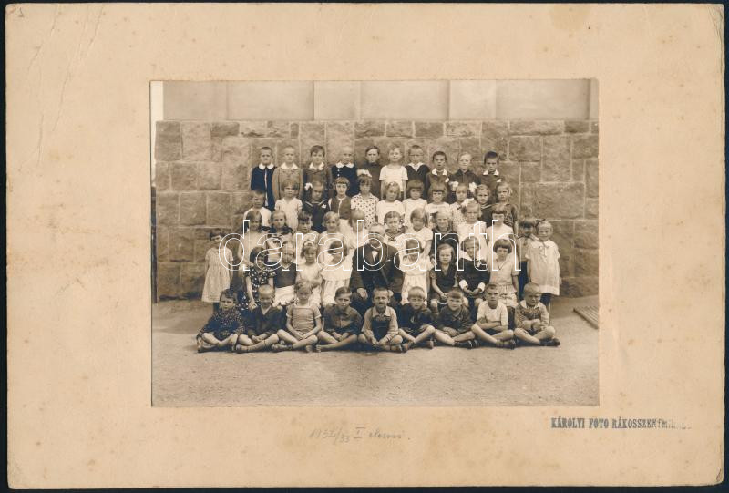 1933 Rákosszentmihály, Károlyi fényképész felvétele az elemi iskola elsÅ‘ osztályos tanulóiról, vintage fotó, ezüst zselatinos fotópapÃron, a hátoldalon a tanulók neve soronként feltüntetve, 11,3x15,6 cm, karton 17x25 cm
