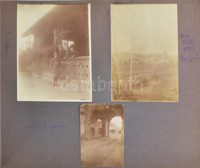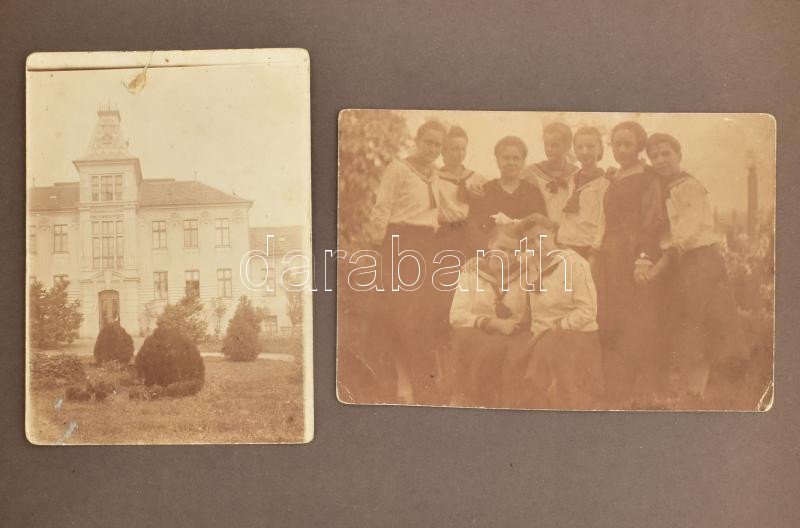 cca 1910-1920 Jeszenszky Ilona (1891-1970), a Budapesti Evangélikus Leánygimnázium tanárának családi fotóalbuma: szüreti képek, leánynevelő intézet épülete, vadászat, katonafotó, csoportképek, stb., főként a felvidéki Modor községben készült fotók, ahol a Jeszenszky család élt. Összesen kb. 50-60 db fotó + későbbi, kézzel írt levelek és képeslapok. Vegyes méretben és állapotban, korabeli zsinórfűzéses albumban, 27,5x20,5 cm