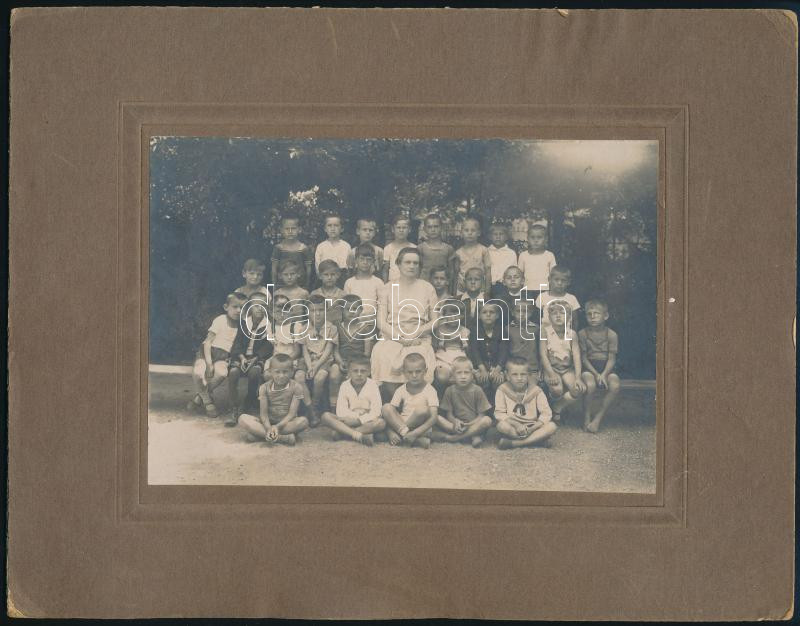 Leírás: cca 1922 Budapest, Wekerletelepi elemi iskola tanulói, Winkler Rezső fényképész pecsétjével jelzett, 12x17 cm, karton (sérült) 21x27 cm