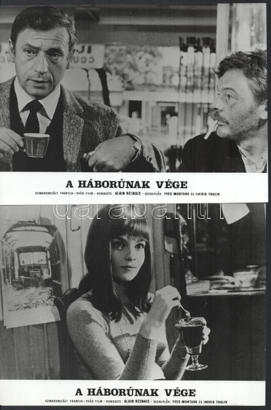 cca 1966 ,,A háborúnak vége" című francia - svéd film jelenetei és szereplői (főszereplő Yves Montand és Ingrid Thulin), 7 db vintage produkciós filmfotó ezüst zselatinos fotópapíron, a használatból eredő (esetleges) kisebb hibákkal, 18x24 cm