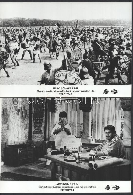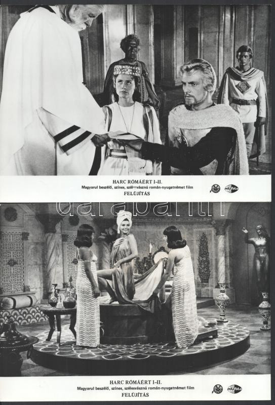 cca 1968 ,,Harc Rómáért" című román - nyugatnémet film jelenetei és szereplői, 6 db vintage produkciós filmfotó ezüst zselatinos fotópapíron, a használatból eredő (esetleges) kisebb hibákkal, egy kép elszíneződött, 18x24 cm