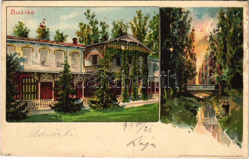 Leírás: 1899 (Vorläufer) Buziás, fürdő szálló, híd / spa hotel, bridge. Kunstanstalt Kosmos 146. litho (fl)