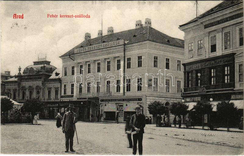 1911 Arad, Fehér Kereszt szálloda, Fonciere pesti biztosító, Neumann M., Ifj. Klein Mór és Husserl üzlete, Braun Gusztáv kávéháza / hotel, shops, cafe, insurance company
