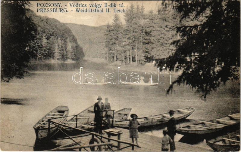 Leírás: 1912 Pozsony, Pressburg, Bratislava; Vödriczvölgy II. Vödric tó, csónakok. Kaufmann kiadása / Weidritzthal, II. Teich / Vydrica lake, boats (EK)