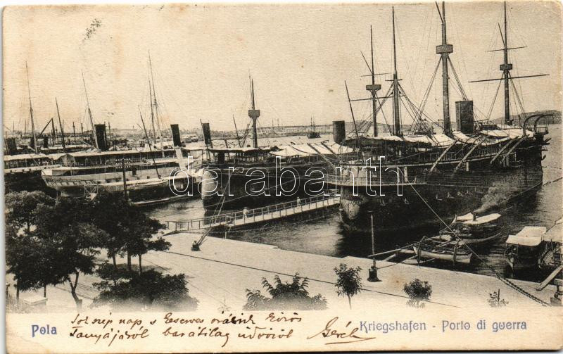 1905 Pola, K.u.k. Kriegsmarine Kriegshafen / SMS Erzherzog Albrecht osztrák-magyar páncélos csatahajó és SMS Prinz Eugen a kikötőben / Austro-Hungarian Navy port: SMS Erzherzog Albrecht ironclad warship and SMS Prinz Eugen. Dep. A. Bonetti (EK)