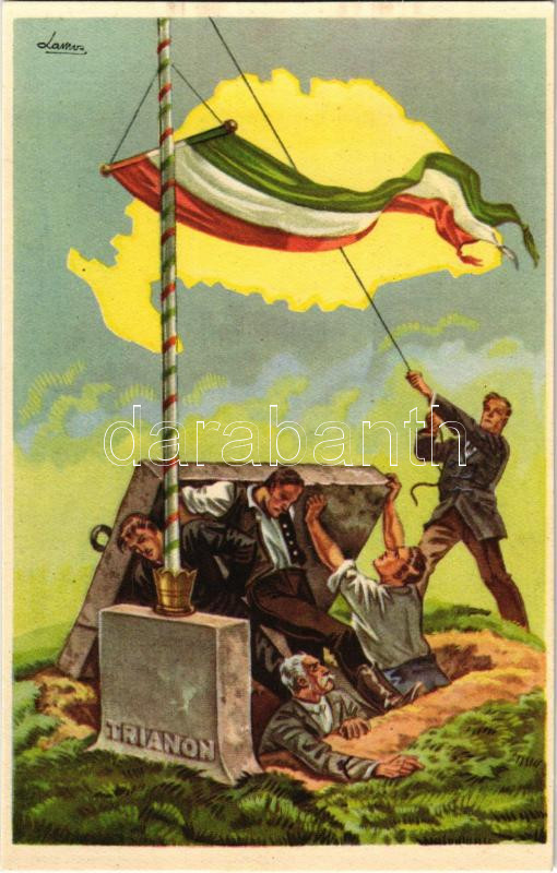 Trianon. Hátoldalon "Az ezeréves egységes Magyarország és a tiranoni béke szörnyszülöttje" térképpel. Kiadja az Ereklyés Országzászló Nagybizottsága / Hungarian irredenta propaganda, Hungarian flag, map of the Trianon peace treaty on the backside s: Lamoss