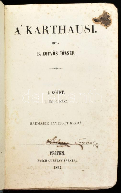 B. Eötvös József: A' Karthausi. I. kötet. 1-2. rész. Pest, 1852, Emich Gusztáv, 309 p. 3. kiadás. Átkötött kopott, foltos félvászon-kötés, kissé sérült gerinccel, foltos, firkált lapokkal, egy lap sarkán kis hiánnyal.