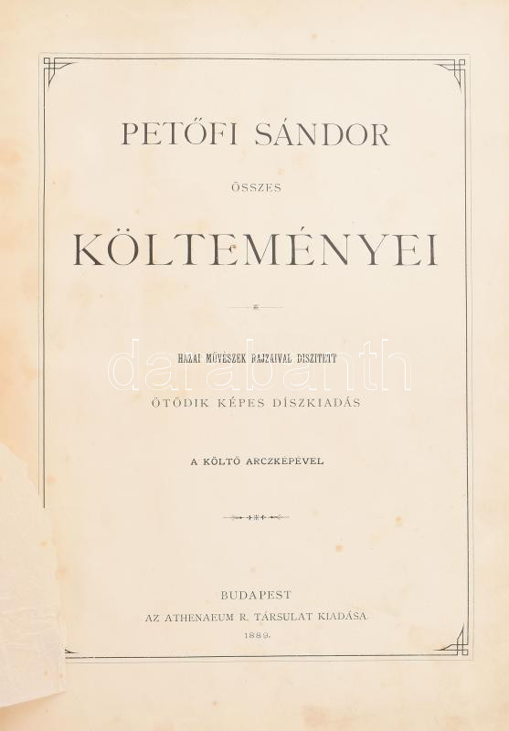 Petőfi Sándor összes költeményei. Bp., 1889, Athenaeum. Kiadói egészvá... https://www.darabanth.com/hu/452-Gyorsarveres/452.0/Konyvek/Konyvek-Egyeb-ritkasagok~1000038/Petofi-Sandor-osszes-koltemenyei-Bp-1889-Athenaeum-Kiadoi-egeszvaszon-kotes-aranyozott~II3014205