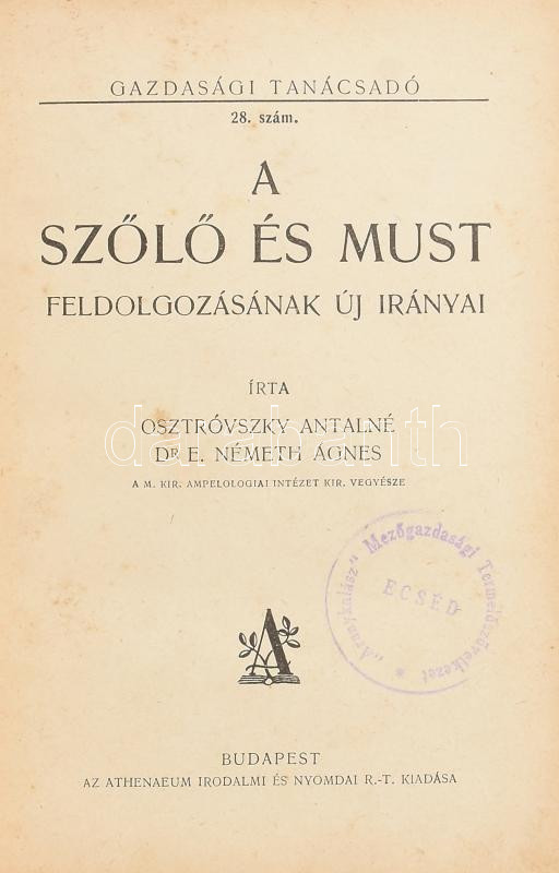 Osztróvszky Antalné Dr. E. Németh Ágnes: A szőlő és must feldolgozásának új iránya. Gazdasági Tanácsadó 28. sz. Bp.,[1928], Athenaeum, 240 p. Szövegközi és egészoldalas illusztrációkkal. Átkötött félvászon-kötésben, helyenként kissé foltos, a címlapon bélyegzővel.