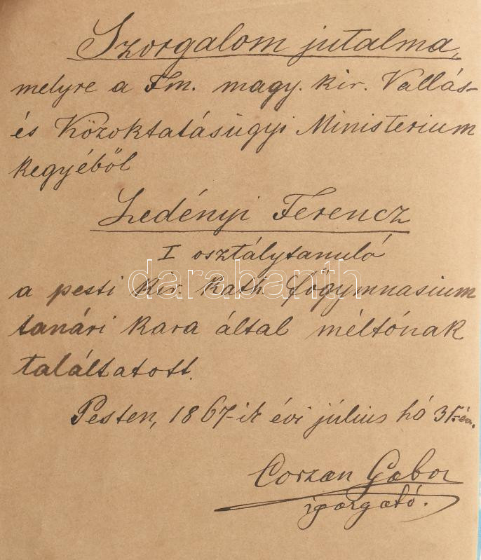 Benne 1867-es ajándékozási sorokkal, Corzan Avendano Gábor (1827-1903) matematikus, az V. Kerületi Magyar Királyi Állami Főgimnázium igazgatójának autográf soraival, aláírásával.