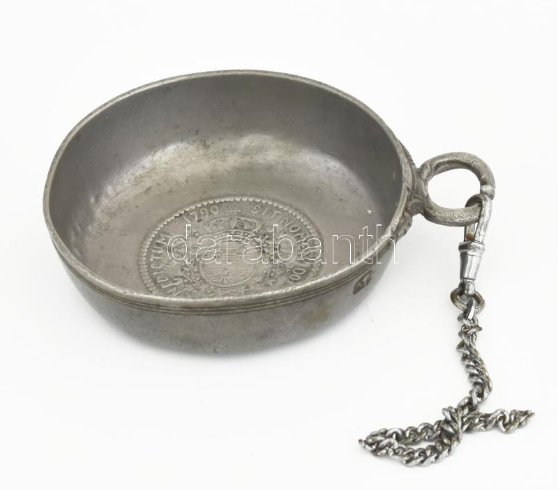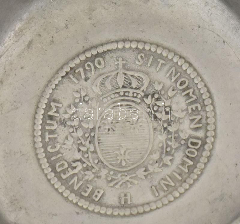 Leírás: Antik ón címeres mintás tálka, jelzéssel, kopással, d: 7 cm
