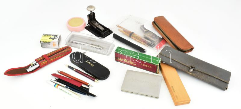 Leírás: Vegyes régi íróasztal tétel: tuskihúzó, tollak, lyukasztó, töltőtollak, hegyek, pecsételőpárnák, stb