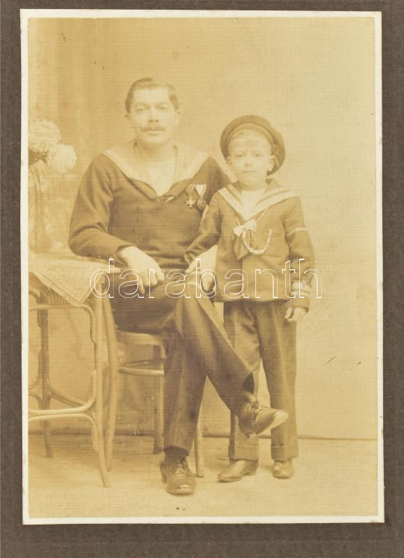 cca 1915 Cs. és Kir. Haditengerészet matróza kisfiával, kitüntetésekkel, kartonra kasírozott fotó H. Soor pólai műterméből, 14,5x10,5 cm, karton: 29x22 cm